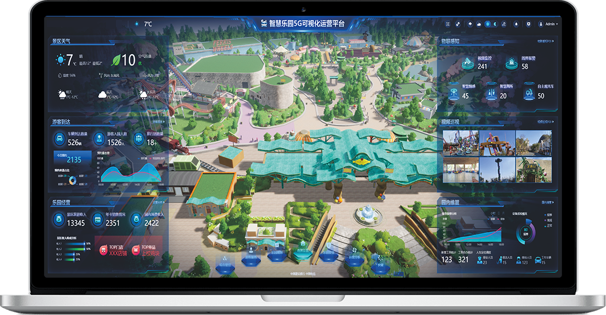 智慧園區(qū)包含三維建模及動(dòng)畫渲染技術(shù),?精度還原園區(qū)范圍內(nèi)建筑及游樂(lè)設(shè)施,打造逼真虛擬場(chǎng)景,同步利?5G數(shù)據(jù)傳輸通道對(duì)接園區(qū)安防、消防、觀光?輛及其他智能物聯(lián)設(shè)備,打通經(jīng)營(yíng)數(shù)據(jù)及?融?付系統(tǒng)通道,?體可視化實(shí)現(xiàn)園區(qū)綜合維管,實(shí)時(shí)動(dòng)態(tài)掌握?qǐng)@區(qū)整體狀況,全?提升樂(lè)園整體運(yùn)營(yíng)效率。
